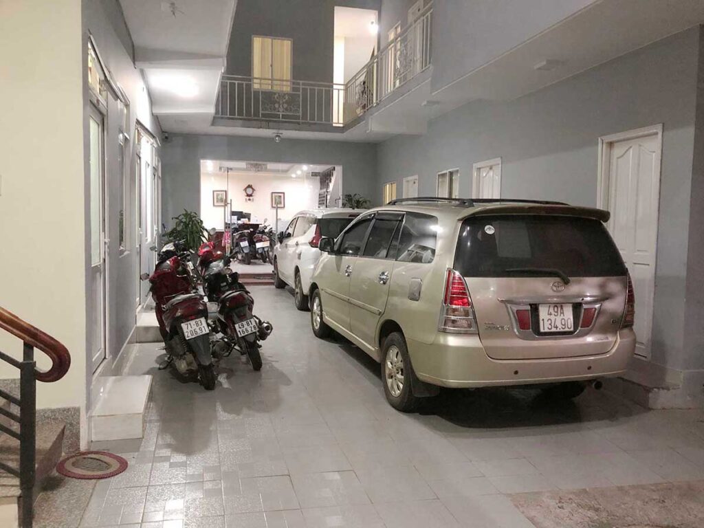 Bãi đỗ xe trong sân khách sạn.